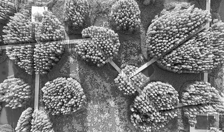 5月5日,在南昌高新区鱼尾洲公园水域之上,水杉、落羽杉等树木绿意盎然,栈道蜿蜒其间,展现自然与人文之美。