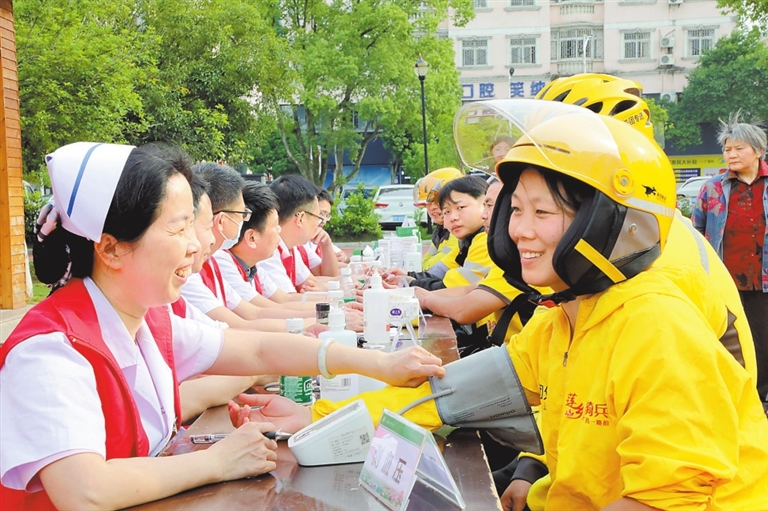 4月28日,广昌县人民医院第一党支部组织医务工作者来到该县九员驿站为户外劳动者提供免费健康体检服务。