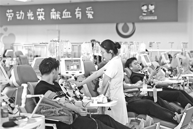 5月7日,在天津市血液中心,护士查看献血者的状态。