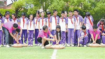 5月7日,南昌大学第一附属医院志愿者走进南昌市育新学校教育集团北京西路校区,开展防溺水知识科普,教授学生溺水自救互救技能。图为志愿者现场指导学生练习心肺复苏急救方法。