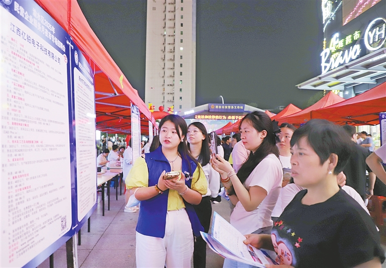 5月6日晚,新余市渝水区2025年民营企业服务月夜市专场招聘会在城北街道恒太城广场举行,50余家企业提供千余个就业岗位,吸引众多求职者前来应聘。通讯员 廖海金摄