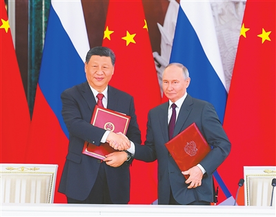 当地时间5月8日上午,俄罗斯总统普京同中国国家主席习近平在莫斯科克里姆林宫举行会谈。会谈后,两国元首共同签署《中华人民共和国和俄罗斯联邦在纪念中国人民抗日战争、苏联伟大卫国战争胜利和联合国成立80周年之际关于进一步深化中俄新时代全面战略协作伙伴关系的联合声明》。新华社记者 王 晔摄