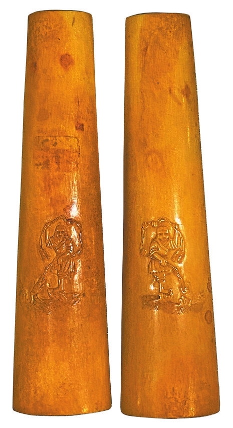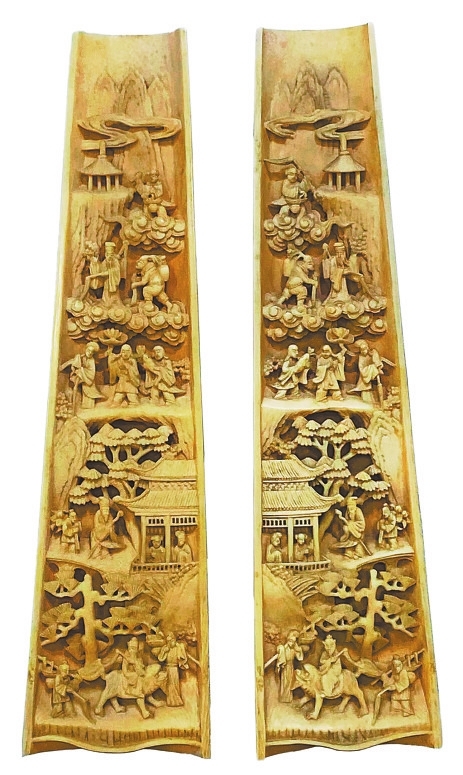 鹰潭市博物馆馆藏民国象牙雕人物臂搁(如图),长24.9厘米,最宽处6.4厘米,为扬州牙刻精品佳作。整体颜色呈象牙白,由象牙牙尖一分为二制成。背部雕刻刘海戏金蟾图案,刘海双手挥舞钱串,钓戏跃浪而起的金蟾;内侧以减地浮雕技法刻八仙人物故事,由上至下,由远及近,仙山缥缈,亭台楼阁,祥云劲松,八仙人物蜿蜒而上,神采奕奕,宛若登极仙界,动感十足。人物造型生动有趣,情景布局密而不乱,错落有致,刀法精湛,刻画细腻。