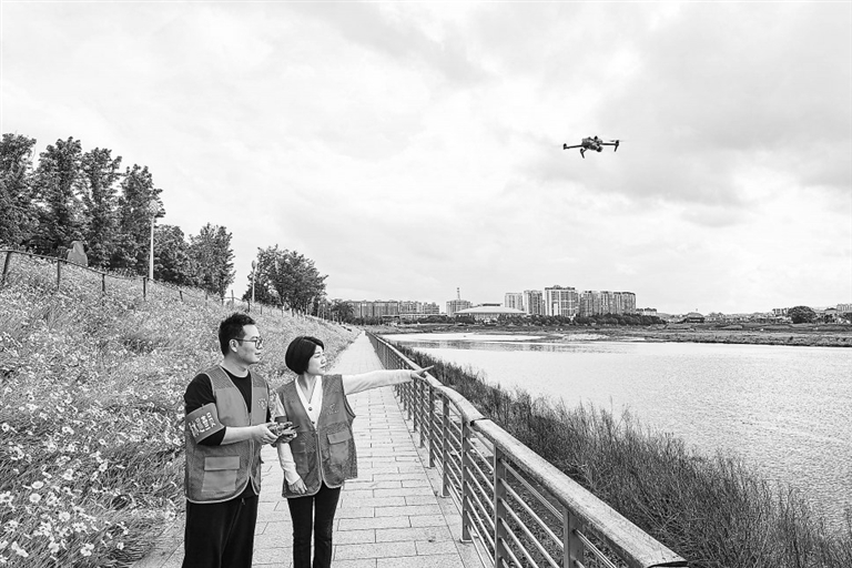 入夏以来,广昌县构建“人工巡查+科技赋能”立体化防溺水体系,守护群众生命安全。图为5月9日,该县社区工作人员在旴江河岸边操纵无人机进行防溺水巡查。特约通讯员 曾恒贵摄