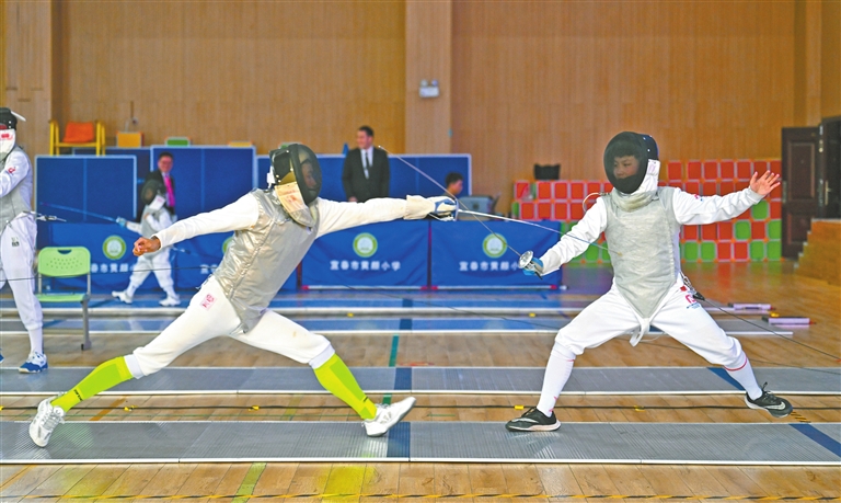 5月10日,2025年江西省击剑冠军联赛(第二站)在宜春市黄颇小学拉开帷幕。本次赛事吸引了全省近200名击剑运动员参赛。图为击剑运动员比赛精彩瞬间。