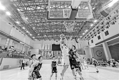 近年来,湖口县积极推进全民健身运动,广泛开展各类体育赛事,提高群众身体素质。图为5月5日,一场篮球赛在该县一所中学体育馆精彩上演。