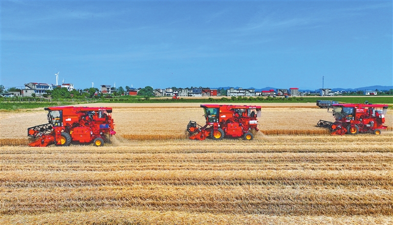 5月13日,九江市柴桑区江洲镇联洲村,农机手正驾驶大型收割机在麦田收割冬小麦。特约通讯员 朱海鹏摄