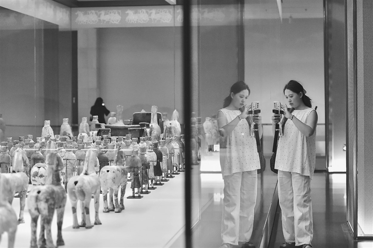 5月16日,游客在山东省青州博物馆拍摄展出的文物。