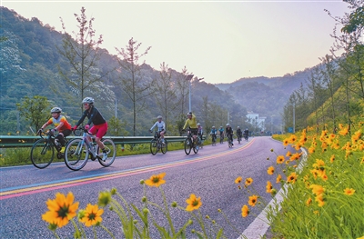 万载县聚焦乡村公路升级,在路旁种植金鸡菊等,提升路域“颜值”。图为5月14日,骑行爱好者在白良镇秀美的乡村公路上畅快骑行。