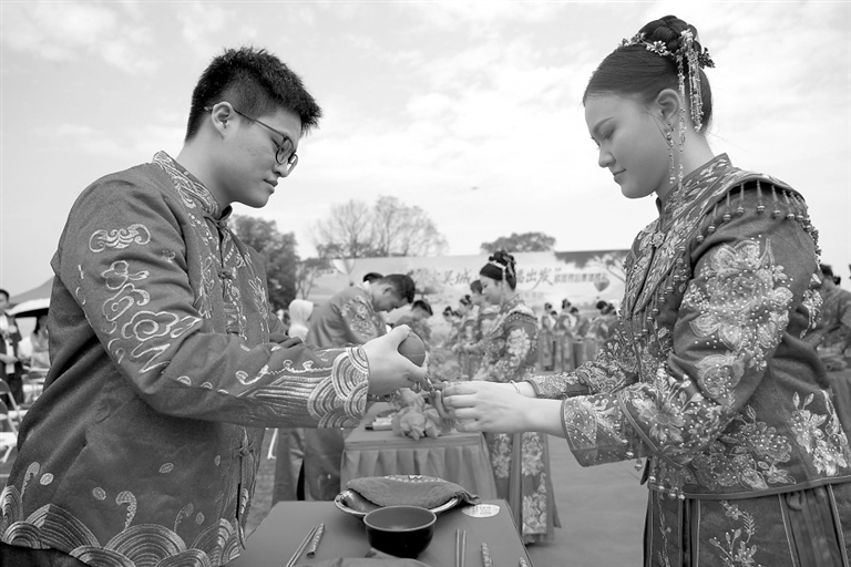 5月17日,在赣江新区永修组团吴城镇候鸟小镇,15对新人身着国风礼服,在众人的见证下盟誓成礼,并发出婚事新办、喜事俭办的倡议,以实际行动引领婚嫁新风尚。