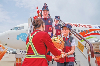 5月18日,工作人员在昆明长水国际机场为中国政府援缅卫生防疫队队员献花。当日12时许,中国政府援缅卫生防疫队在圆满完成震后防疫援助任务后,乘机抵达昆明长水国际机场。新华社发(彭奕凯摄)