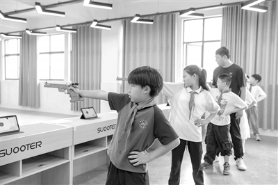 德兴市凤凰小学注重特色课程建设,开设了射击、剪纸等特色课堂。图为近日,该校激光手枪射击训练室里,孩子们在老师的指导下练习。本报全媒体记者 徐 铮摄