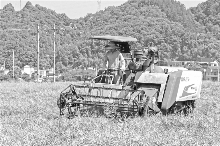 5月14日上午,在浮梁县寿安镇月山村,一台加装了油菜收获设备的水稻收割机在连片的油菜地穿梭,该县11.2万亩油菜收割工作正式拉开帷幕。通讯员 吴国庆摄