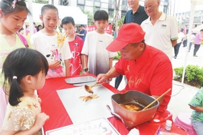 2025年5月18日是第49个国际博物馆日,于都县开展了客家擂茶制作、拓印、陶艺等展览展示展演展销活动。图为在雩都古街,于都糖画制作技艺代表性传承人在为游客展示糖画制作技艺。肖章荣 摄