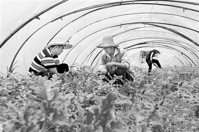5月19日,在奉新县农牧渔场农业分场的西瓜大棚内,农技人员与瓜农查看西瓜长势,做好管护工作。