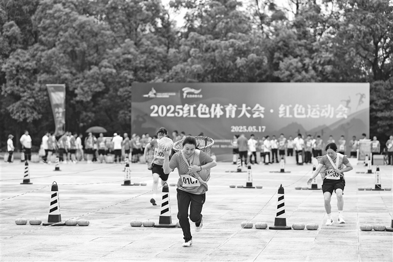 当日,“红动江西”红色运动会在瑞金市中华苏维埃纪念园开赛。来自长征沿线部分地区特邀代表队及江西11个设区市的代表队,在“抢救伤员”“挑粮上井冈”“红土地上收南瓜”“飞夺泸定桥”等融入革命历史场景的团体项目中展开竞技。比赛既展现体育竞技风采,更让运动员在沉浸式体验中深刻感悟革命先辈的奋斗精神。“抢救伤员”项目是抬担架接力跑,四人一组的队员们抬着担架健步如飞,在50米赛道上演绎“生死时速”。河南省代表队的小伙子们冲过终点时,汗水已浸透后背,但脸上洋溢着笑容:“抬的不是担架,是当年红军战士的担当。”