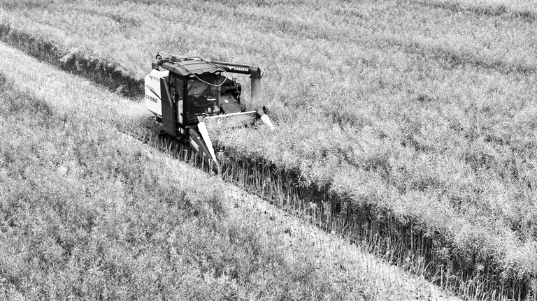 5月17日,在庐山市温泉镇通书院村,农机手正驾驶收割机收割油菜。特约通讯员 韩俊烜摄