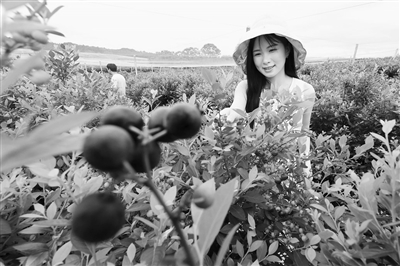 近年来,抚州市东乡区有效整合荒山旱地,种植蓝莓1.6万余亩。图为5月20日,该区红光垦殖场新田蓝莓基地正式开园,游客前来体验采摘乐趣。特约通讯员 何江华摄