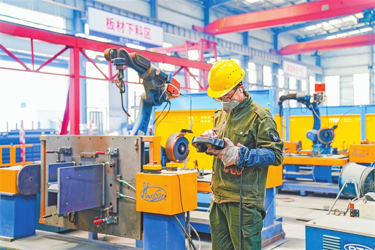 抚州市临川区大力实施智能制造优先发展战略,推动制造业向“智造”升级。图为5月14日,位于该区展坪镇的中铁十一局集团新材料科技有限公司抚州工业分公司的生产车间内,工人正在设置焊接机器人自动作业程序。