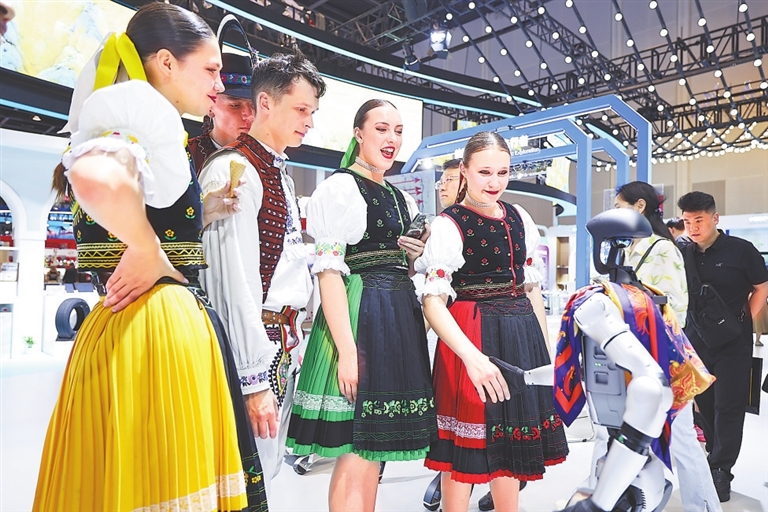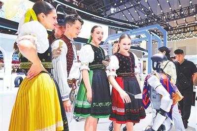 5月22日,外籍参会代表在第四届中国-中东欧国家博览会暨国际消费品博览会现场与人形机器人互动。当日,第四届中国-中东欧国家博览会暨国际消费品博览会在浙江宁波开幕。本届博览会除14个中东欧国家展商参展之外,还吸引英国、法国、德国、意大利、西班牙等9个国家参展商踊跃参展。新华社记者 江 汉摄