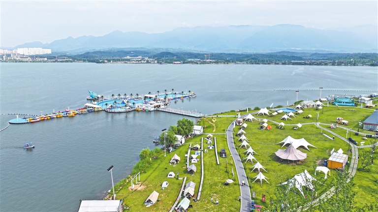 九江市八里湖畔九派之眼湖畔营地,依山傍水,融合了户外露营、户外运动、星空舞台、露天电影等健康休闲业态,是一个四季皆宜的城市旅游休闲目的地。图为5月17日,九江市民在营地游玩。