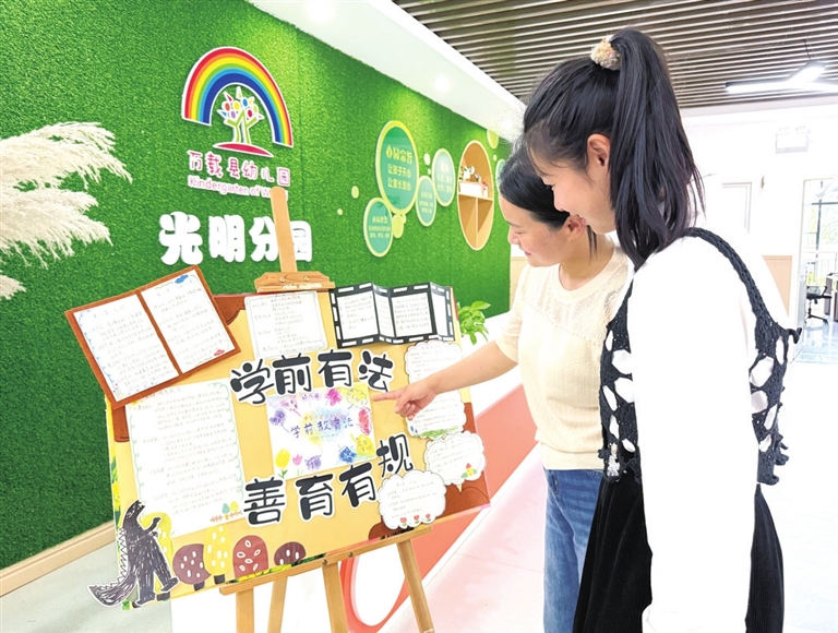 近日,万载县幼儿园组织教师开展“学前有法,善育有规”主题手抄报竞赛,创新形式学习学前教育法。教师紧扣法律核心条款,结合幼儿教育实际,用多彩画笔和精巧设计呈现学习成果,并在构思、创作中深化了对学前教育法的理解,为依法科学开展保育教育工作筑牢根基。图为幼儿园教师观看手抄报成果展。黄秋英摄
