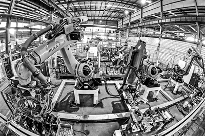 近年来,南昌经开区加速推动新能源汽车及动力电池产业集聚,大力开展“延链、补链、强链”招商,已经集聚了2家整车制造企业和70多家链上核心零部件企业。图为5月19日,在南昌经开区机电工业科技园,江西大东汽车配件有限公司焊接生产线上,机械手臂挥舞,一派繁忙景象。 本报全媒体首席记者 李 劼摄