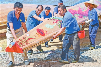 5月2日,位于万年县梓埠镇柴埠村的贤涨龙舟基地,不时传出阵阵机器打磨木头的声响。师傅们或拿墨斗为木头弹线,或用打磨机处理木头,或用油漆画龙头龙身……一艘崭新的龙舟在他们的巧手下逐渐成形。“从一根良木到一艘龙舟,需要历经做龙骨、扎龙根、雕龙头、刻龙尾、上漆等20多道工序。”上饶市级非遗“万年梓埠龙舟制造技艺”代表性传承人李光定制作龙舟已有50多个年头了,龙舟制造的每一个步骤他都熟记于心。凭借着丰富的经验和精湛的技艺,他不断探索创新,在造船用材、制作技艺、款式设计等方面大胆突破,开发出多种新颖款式的龙舟,满足了客户的多样化需求。