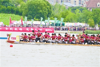 5月23日,2025中国南昌国际龙舟赛在南昌红谷滩区九龙湖水域擂鼓开赛,来自国内外50支龙舟队、约1500名运动员争相竞渡。