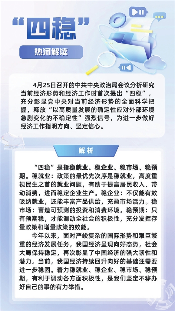 4月25日召开的中共中央政治局会议,在分析研究当前经济形势和经济工作时首次提出“四稳”,释放“以高质量发展的确定性应对外部环境急剧变化的不确定性”的强烈信号,为进一步做好经济工作指明方向、坚定信心。坚持把高质量发展作为首要任务,江西应当立足省情实际,充分依托区位优势、产业优势和资源优势,抓好一揽子政策和接续措施全面落地见效,为奋力谱写中国式现代化江西篇章注入强劲动力。