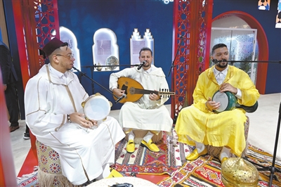 ◀参展工作人员在摩洛哥展台为观众演奏音乐。