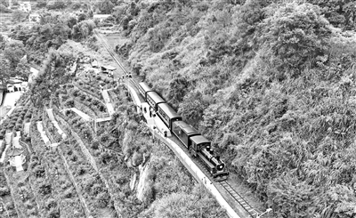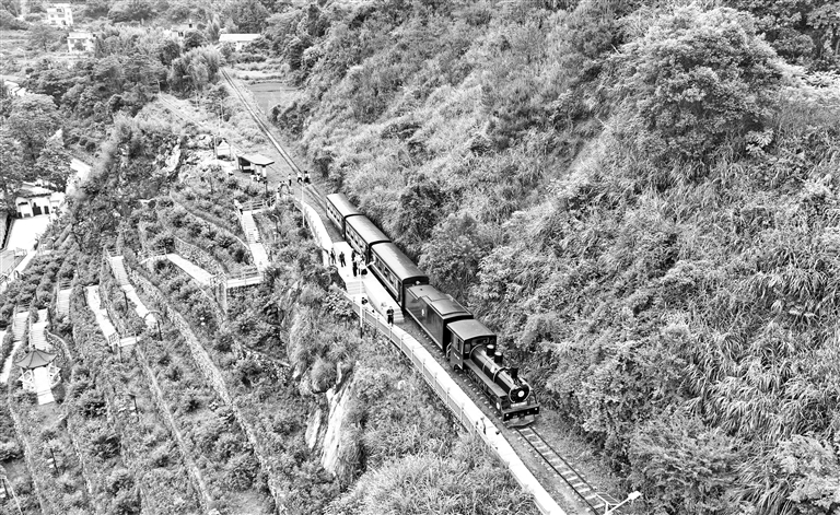 5月26日,在上犹县梅水乡,赣南森林小火车穿梭于青山绿野、田园村落间。赣南森林小火车曾肩负林业运输重任,如今成为乡村旅游亮点。通讯员 李建平摄