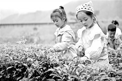 5月24日,在铅山县武夷山镇仙山岭茶园,孩子们正在体验采茶。