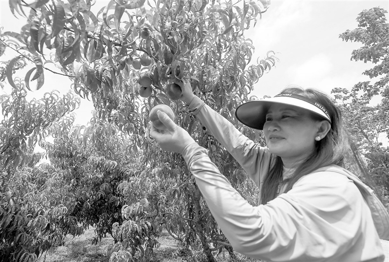 5月20日,湖口县马影镇柯观村水蜜桃种植基地,游客正在采摘成熟的油桃。