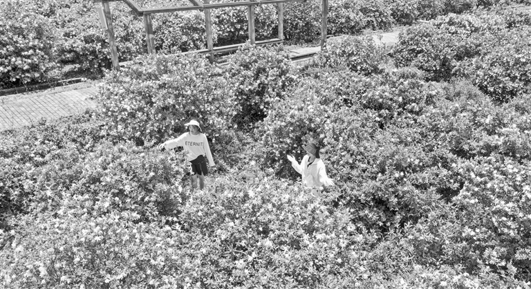5月21日,在共青城市江益镇跃进村陌上花开栀子园,大片栀子花竞相绽放,吸引游客前来赏景。