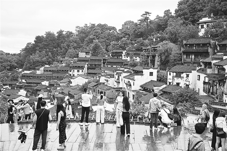 婺源县全力促进农文体旅商融合发展,“中国最美乡村”品牌深入人心、美名远扬,实现了旅游全年没有淡季、四季都是旺季。图为5月23日,游客在婺源篁岭景区游玩、拍照。本报全媒体记者 吴文兵摄