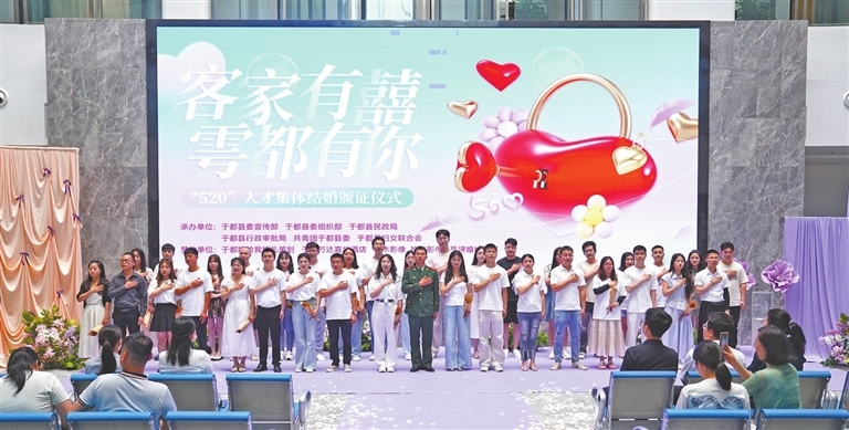 5月20日,于都县举办集体结婚颁证仪式。活动当天,18对新人欢聚一堂,领取结婚证并郑重宣誓。本报全媒体记者 杨文斌摄