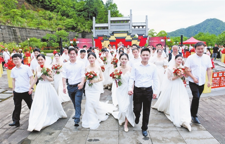 5月20日,德兴市凤凰湖景区举办“铜德同心、德之有兴”集体婚礼活动,吸引了省内外52对新人积极参与。