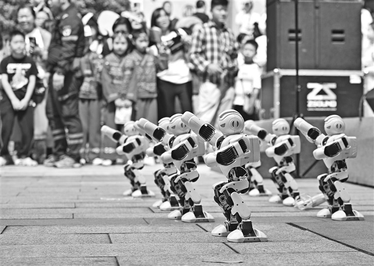 ▲5月24日,在南昌市妇女儿童活动中心举行的“六一”童乐汇暨亲子嘉年华活动中,可以对话的人形机器人、表演舞蹈的编程机器人等,吸引众多少年儿童围观并与之互动。