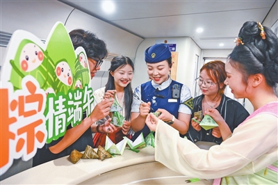 5月25日,在南昌客运段动三车队值乘的D6514次列车上,列车工作人员给旅客送上粽子、香囊和节日祝福。通讯员 鲍赣生摄