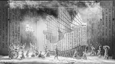 “此书于功名进取毫不相关也!与我们相关也!”高亢的声音响彻剧场,两路布衣一边诵咏一边小跑着从观众席登上舞台。他们手持器皿工具、肩挑粮食作物,耘禾、舂米、推磨;调丝、印染、缝制;利坯、冶铸、踏车……一尊尊造物的剪影在巨型帆船的映照下,似电影大片震撼视听,如凝固史诗动人心弦。一轮轮“男团”的翻飞谢幕,一浪浪观众的朗声应和。“请观众们打开手机灯,演员们向后转,我们来一张大合影!”剧场沸腾了,如排山倒海。