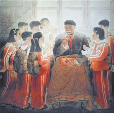 刘文辉的红色主旋律作品《初心》(图1),生动描绘了一群小学生听老爷爷讲革命故事的情景。画面的构图,以围坐聆听的形式,营造出老少互动的亲切场景,自然且富有生活气息,将观者迅速带入特定情境。作品笔法细腻,无论是老人脸上的皱纹,还是孩子们纯真专注的神情,都刻画入微,尽显工笔之精妙。作品以红色为基调,渲染出温馨氛围,生动诠释了红色基因代代相传的初心主题。