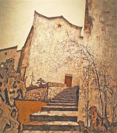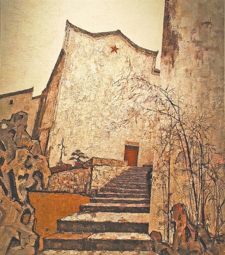 刘兴攀的油画作品《风骨》(图2),描绘的是某地一处革命旧址。在艺术表现手法上,一是弱化空间体积,用半平面化的处理方式表现物象的空间关系,以此达到简洁的造型;二是弱化色彩,用近乎同类色和通过明度上的变化来处理色彩的空间维度,强化了平面中肌理的厚度与层次。作者通过以上技法处理,试图表现岁月的斑驳和宁静的力度。前景的太湖石和竹子除了画面构图的需要,也衬托出革命先辈的浩然风骨。