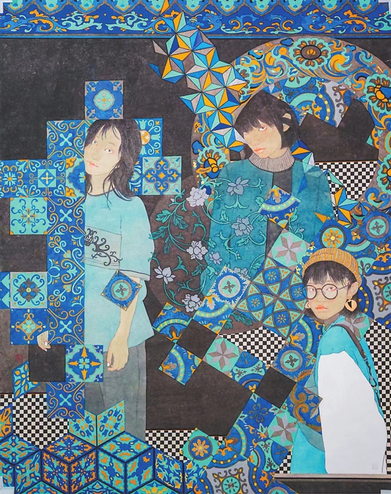 杨晶的国画作品《韶华》(图3),画面处理匠心独运,运用拼贴与破损效果,部分区域似撕裂,显露底层传统花纹,形成虚实交错的效果。在技法上,融合工笔细腻与现代解构,通过色彩碰撞、形象错位,模糊现实与梦境的边界,营造出一种唯美的画面。