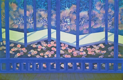 曹灿灿的国画《漫漫》(图4),画面空间采用俯视视角,物象的塑造既有块面概括,又有工笔的细腻精微;栏杆和廊柱纵横对比井然有序,既分割画面空间,又彰显画面秩序,与散落飘浮的粉紫色荷叶以及棕榈植物形成曲直刚柔对比。作者以细腻的笔触描绘繁茂的植被,尽显热带风情,用蓝紫色彩构建出如梦似幻的意境。