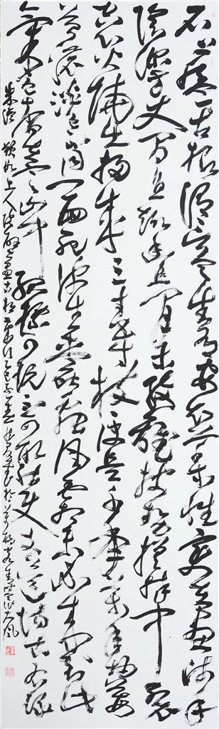 龙友的巨幅草书作品(图5),在展厅尤为引人注目。作品高达4米,气势夺人。整体章法疏密得当,气韵生动;注重字迹大小、墨色枯润对比;字形欹侧相生,线条摇曳多姿。近看线条使转自然,笔道刚健有力,中侧锋变化丰富。观此作品,使人想起唐代的“颠张(张旭)醉素(怀素)”。从线条的迟涩老辣和笔法的多变看,或有张旭和明代祝枝山的影子。古人受材料的限制,很少创作大幅作品。因而,我们今天创作巨幅作品在少有古人借鉴的情况下,更加考验的是作者的悟性和功力,包括全局的谋划与把控、局部的刻画与表现等,其难度不言而喻。