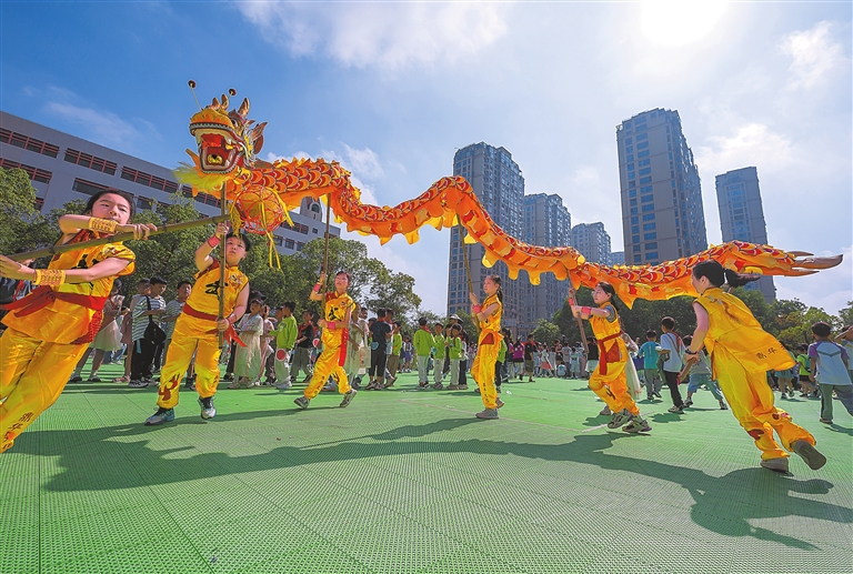 5月30日,新余市逸夫小学举办“非遗润童心·欢乐迎六一”主题活动,通过邀请非遗代表性传承人走进校园,让学生们近距离感受传统文化的魅力。图为学生们在体验舞龙。特约通讯员 赵春亮摄
