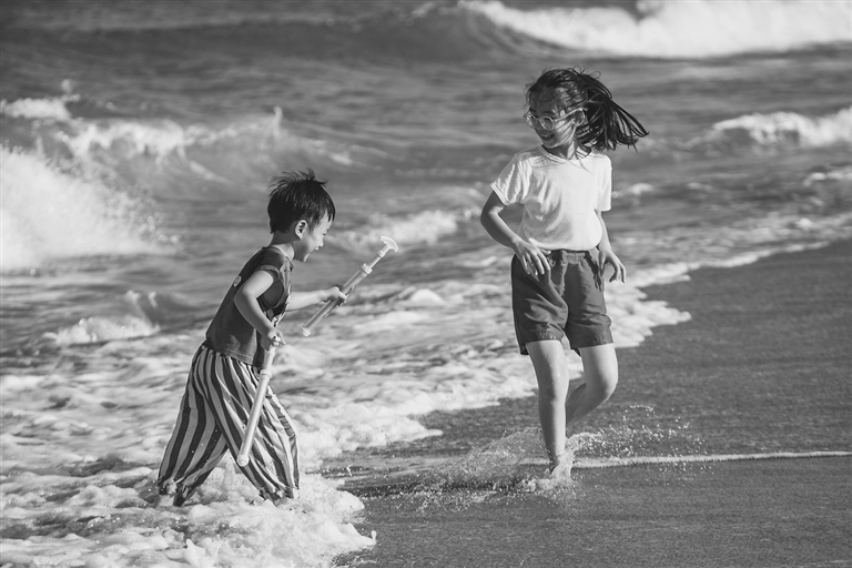 6月2日,小朋友在海南省琼海市博鳌海滨戏水游乐。端午小长假期间,人们纷纷走出家门,休闲放松,乐享假期。新华社发(蒙钟德摄)