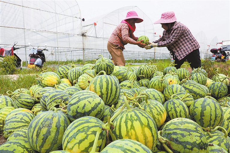 初夏时节,永丰县坑田镇种植的大棚西瓜陆续成熟。图为5月27日,坑田镇塘下村瓜农正在采收大棚西瓜。通讯员 刘浩军摄