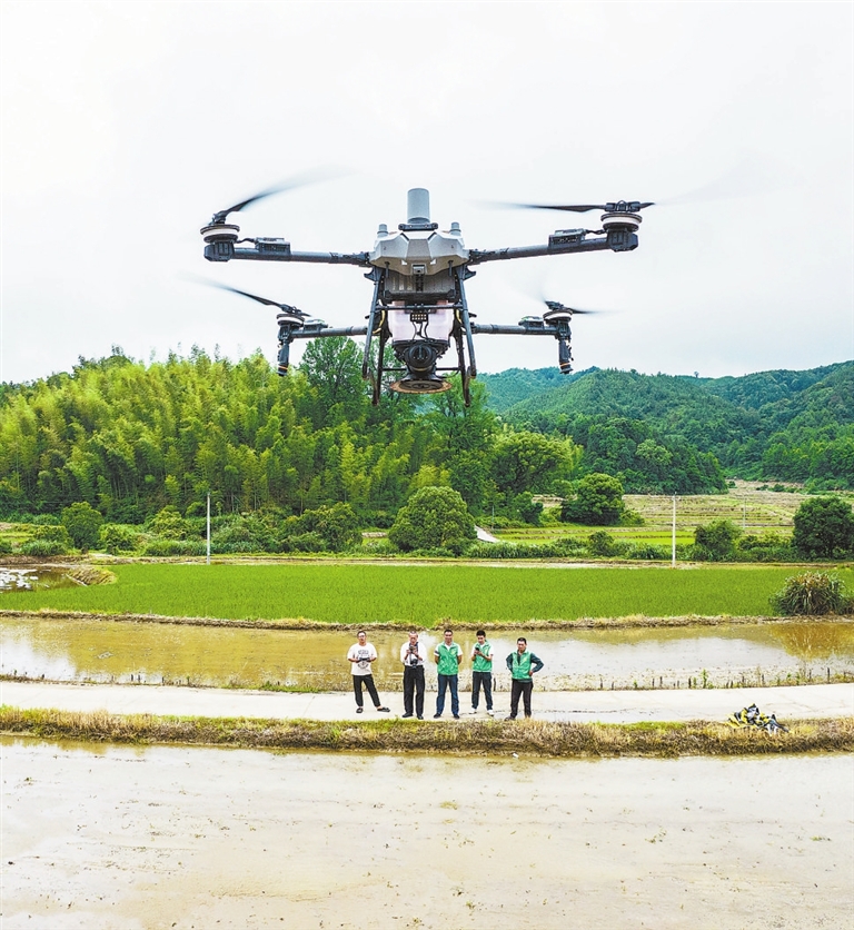近年来,资溪县整体推进农业新技术、新装备运用,为农业增效、农民增收提供技术支撑。图为5月29日,操作员在高田乡黄坊村和丰农业水稻种植基地进行无人机播种。